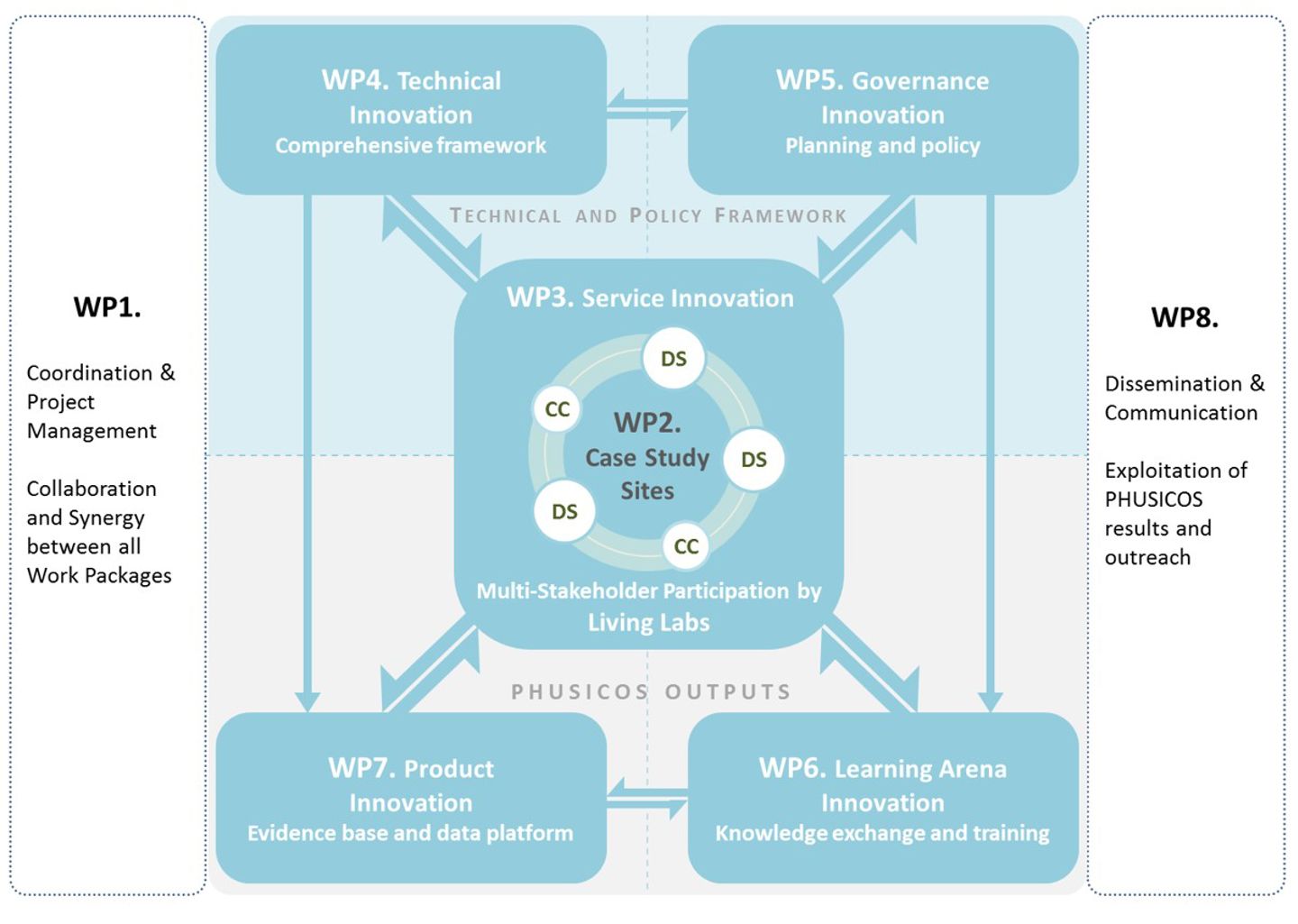 The work to be done in the PHUSICOS project period of 48 months is divided into 8 Work packages (WP). The work plan and project structure including all WPs, (DS = demonstrator site; CC = concept case) is shown in the figure below.