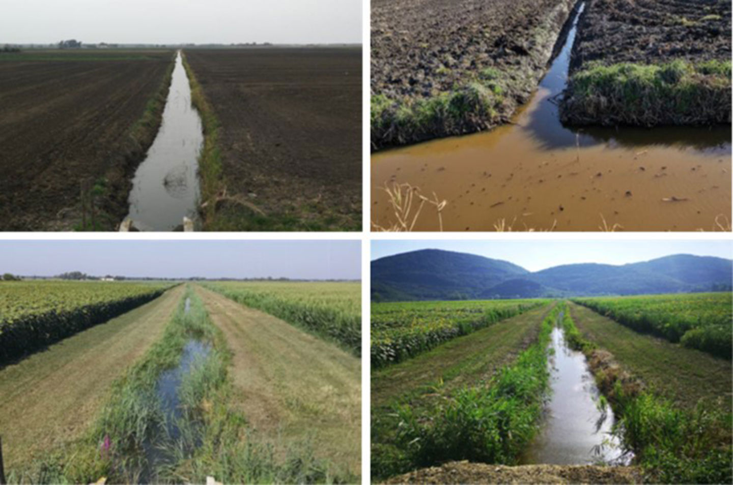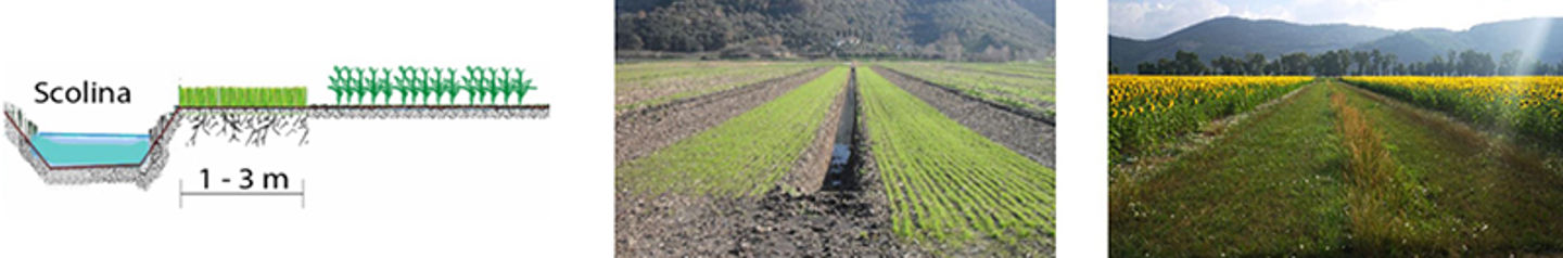 Left: Sketch of the vegetated buffer strips being implemented along irrigation canals (illustration by Autorità di Bacino del Fiume Serchio—ADBS). Middle: Buffer strips in the Studiati area. Right: Buffer strips in the Gioia area (Photos by ADBS)