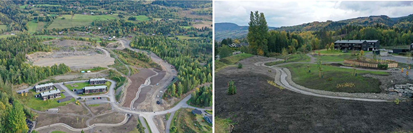 Left: Drone photo of the completed intervention (without the two test fields) from the fall of 2022 (Photo by Øyer municipality). Right: The lower part of the intervention, also shows one of the two test fields. 2022 (Photo by Øyer municipality).