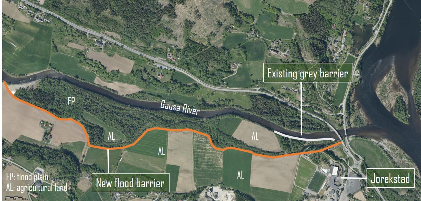 The river Gausa, a tributary river to Gudbrandsdalslågen, experiences regular flooding, with occasional extreme events, such as 1995, 2011 and 2013. The frequency and severity of extreme events is expected to increase over the coming decades. The lower parts of Gausa at Jorekstad, where the river meets Gudbrandsdalslågen, is particularly vulnerable, with agricultural land, housing and infrastructure such as football stadium.