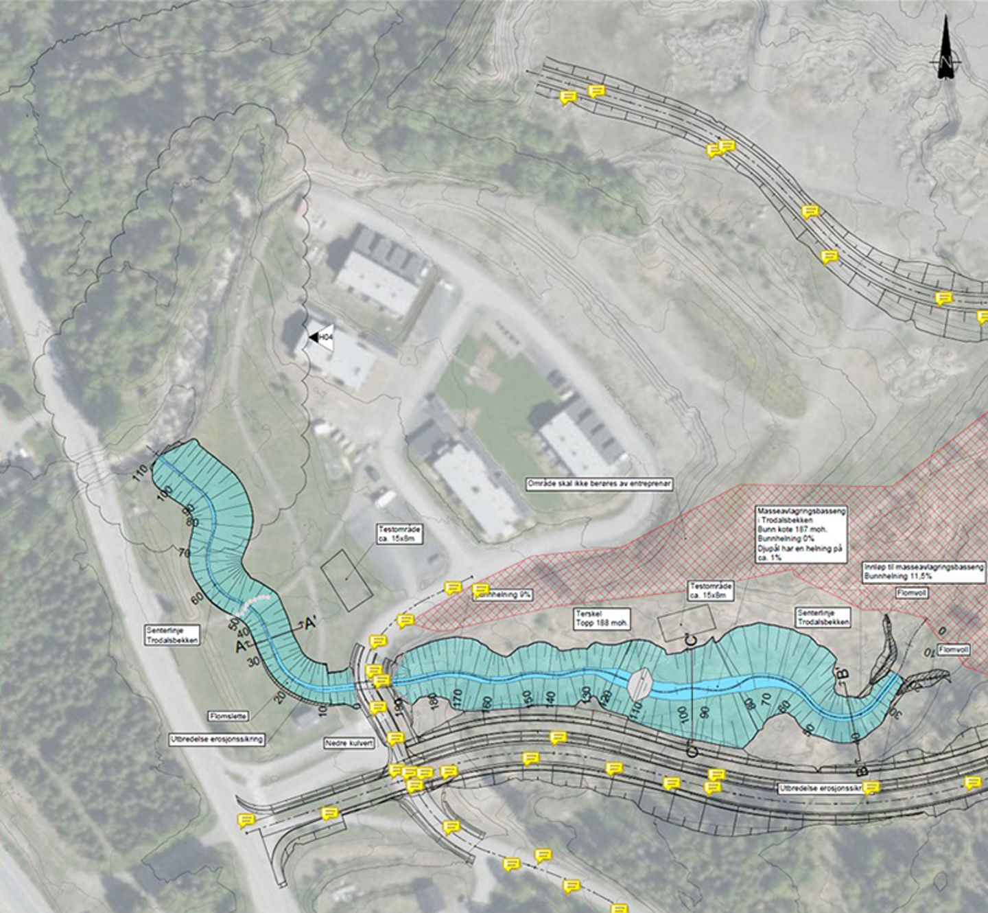Part of the detailed design of the measures in Trodalen. Annotations are in Norwegian. (Design by Norconsult AS)