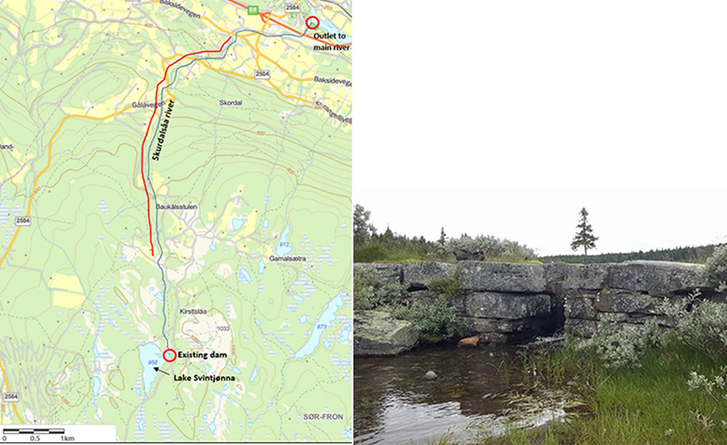 Left: Map of Skurdalsåa. The red line along the river marks the section where selected vegetation clearing is required. The river is ca. 7 km long from the lake to its confluence with the main river. Right: The existing old dam at Lake Svintjønna. The measures will increase the dam height by ca. 0.5 m and establish a new gate and threshold, with automatic monitoring of the lake level.