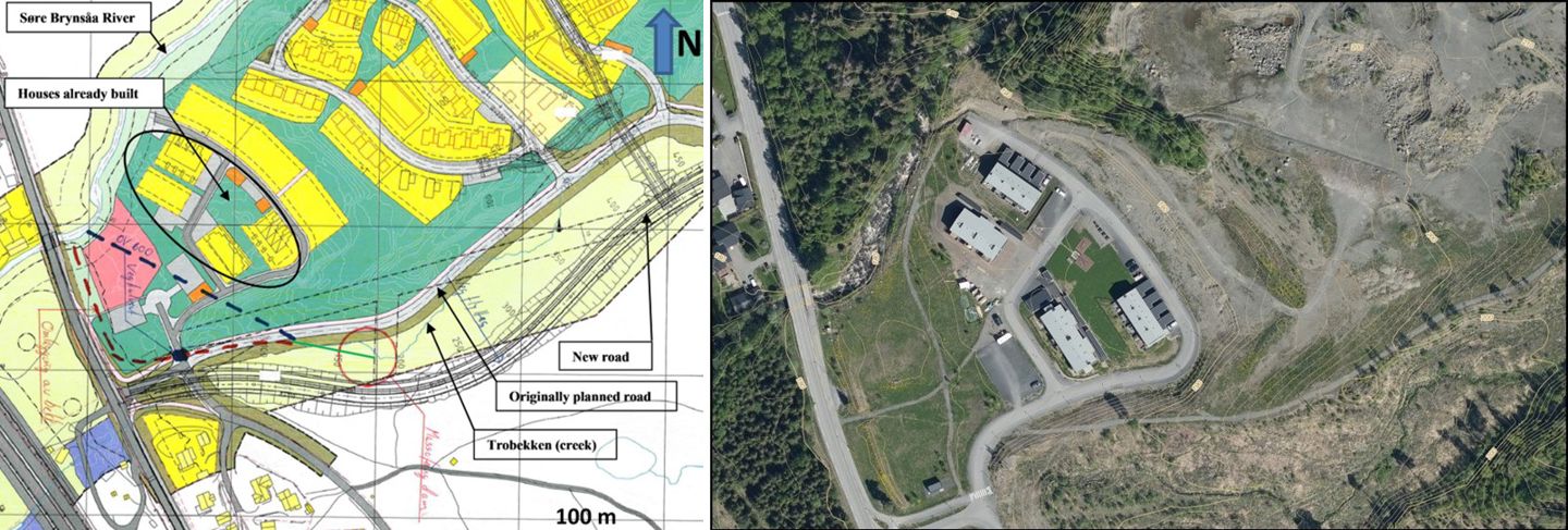 Left: Map of the Trodal housing development area before the interventions. The green line and the stippled black lines mark where the creek is piped. Right: Aerial photo of the area as it is today.