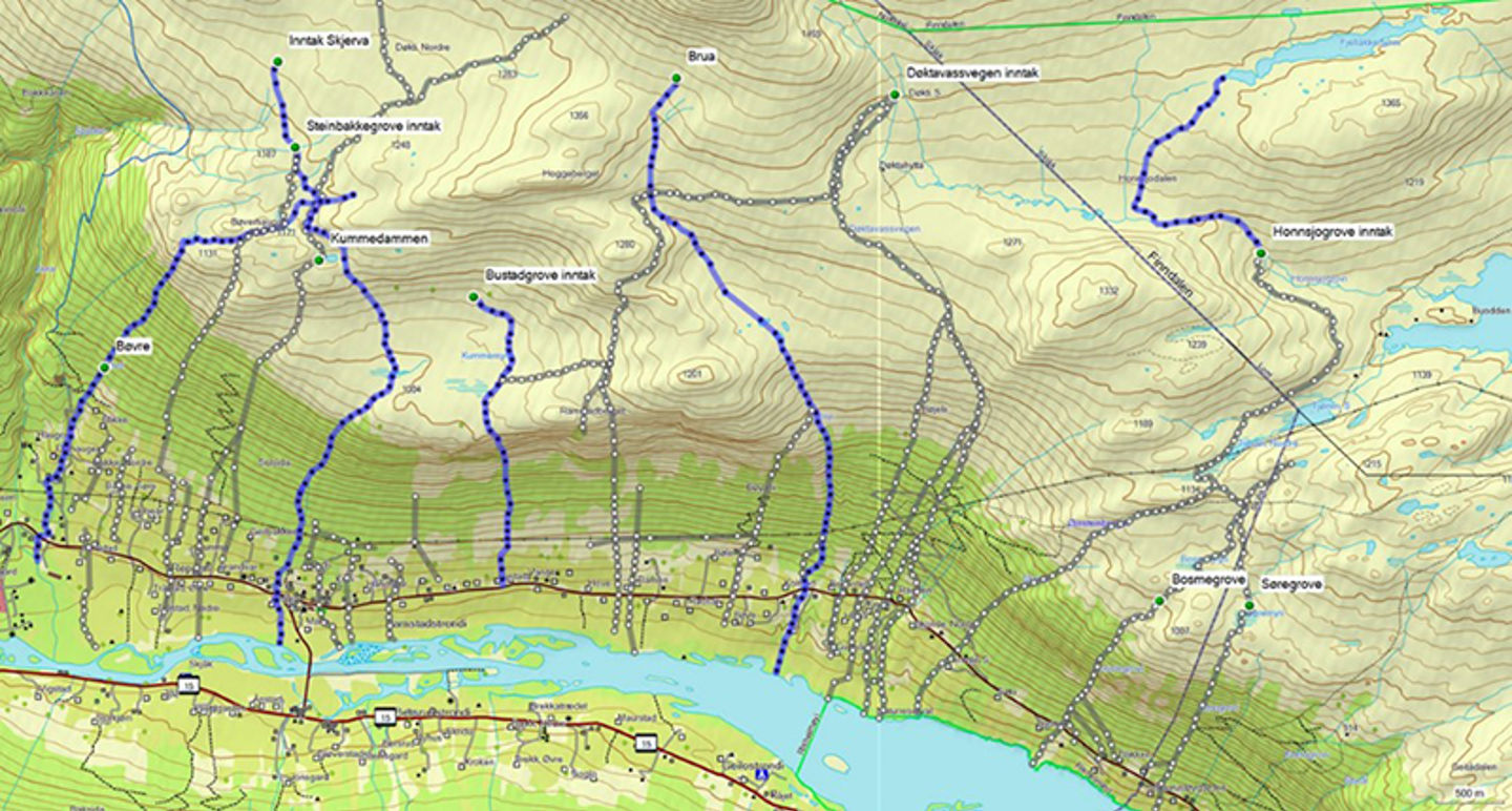 Map of old waterways in a part of Skjåk municipality. The grey tracks are constructed waterways, whereas the blue tracks are natural streams.