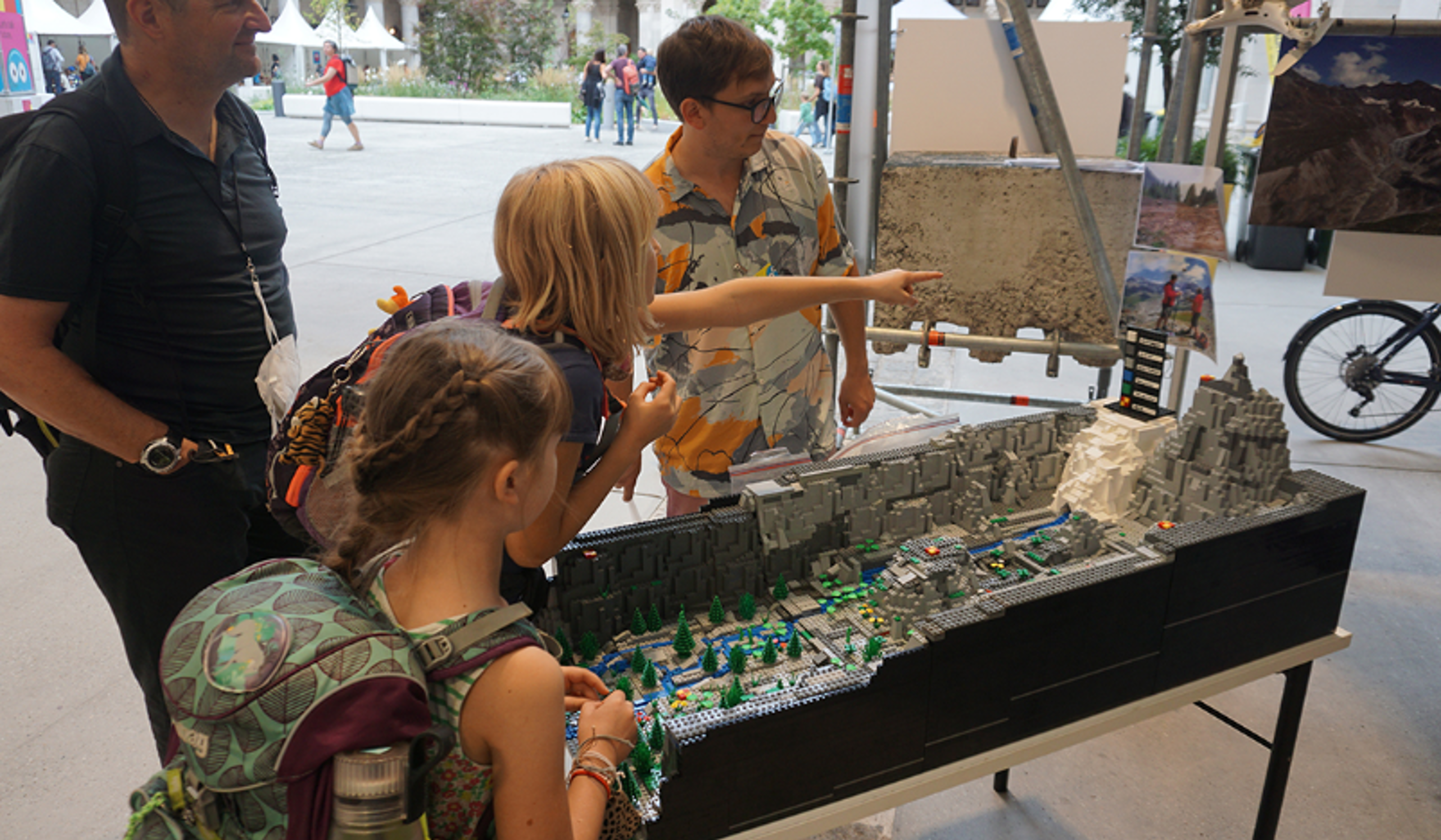 Ecosystem development in the glacier foreland was shown with a LEGO model to explain how geoscientists collect data on natural processes in the field and explained how this knowledge is used to develop and implement Nature Based Solutions. In a hands-on portion, visitors were able to simulate the effect of slope stabilization with vegetation and could help to apply remote sensing techniques to create a 3D point cloud of the LEGO model.