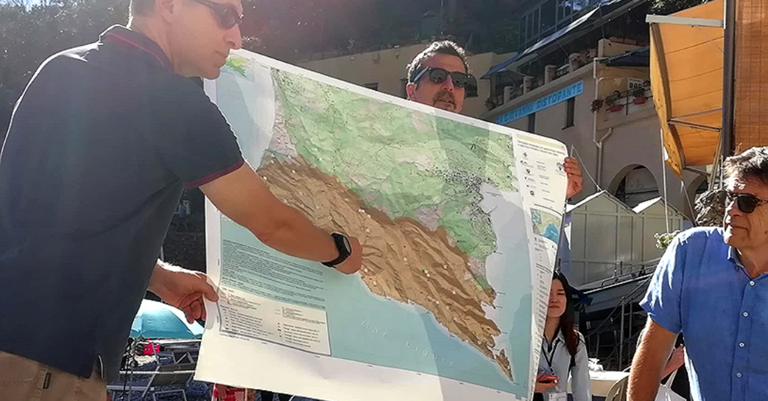 The photo on top shows Guido Paliaga, geologist at CNR-IRPI and Francesco Faccini, senior lecturer in applied geomorphology at the University of Genova, illustrate the vulnerability of the Portofino Natural Park area and the need for interventions and monitoring to preserve the landscape and protect the cultural heritage at San Fruttuoso di Camogli from the impact of hydro-meteorological events.
